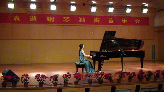 上半场,被人们誉为“可爱的A大调”的《舒伯特A大调奏鸣曲》让人感觉轻松愉快,《牧童短笛》清晰流畅的音符向听众展示了一幅传统的中国水墨画;《山泉》则让听众仿佛亲临大自然,倍感舒适。下半场,袁逍换穿一身粉色的蓬纱晚礼服,带来了《舒伯特即兴伴奏》、《小黑人》和《儿童园地》。音乐会特邀了嘉宾陈哲超,四手联弹《第一匈牙利舞曲》。