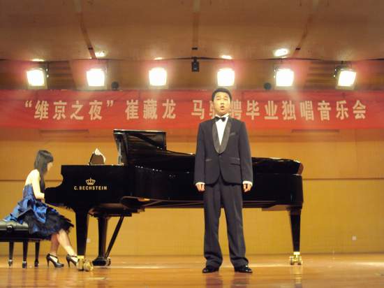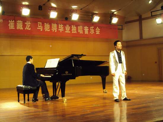 4月20日晚,77779193永利官网06级音乐表演专业的崔藏龙和马驰骋共同在北校音乐厅举办了他们毕业独唱音乐会。77779193永利官网师生300多人观看了此次演出。