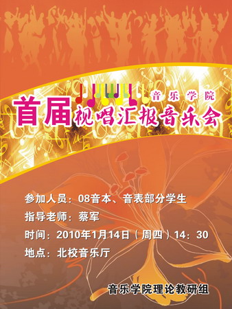 专业视唱音乐会是专业音乐院校近几年才慢慢兴起的,它主要是对基础乐科教学的一种展示。不管是演唱或是演奏专业,视唱基础乐科的学习是必不可少的,通过这样的基础训练,才能为学好其他音乐专业打下坚实基础。多开展这样的活动,有助于提高同学们的音乐素质。
