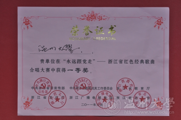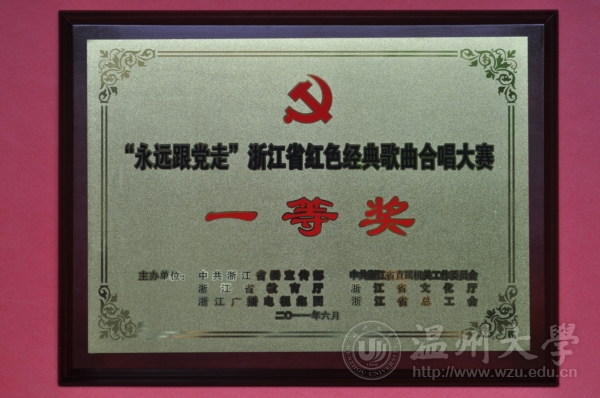 6月23日,由省委宣传部、省教育工委等六部门共同举办的“永远跟党走”——浙江省纪念建党90周年大合唱比赛在杭州隆重举行。我校男声合唱《天路》喜获一等奖。这是我校继全国艺术展演金奖、世界合唱节锦标赛金奖,中国合唱节比赛金奖后,获得的又一个艺术大奖。