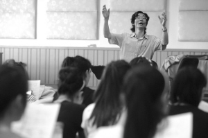 记者在采访中发现,每位教合唱的“达人”们,尽管被繁重的排练累得够呛,不过,一站到合唱团的团员们面前,总是显得很兴奋。前天下午,在一家事业单位合唱团的排练现场,叶文辉的指挥很好地演绎了这句话。排练时,他的表情很丰富,有时张大嘴巴,有时示意轻声,头发也随着手势和身体的摇晃而甩动。稍觉不对,他立刻喊停,一遍遍重来。“声音一定要立起来,不要咬那么清楚”、“再慢一点!慢一点!”……